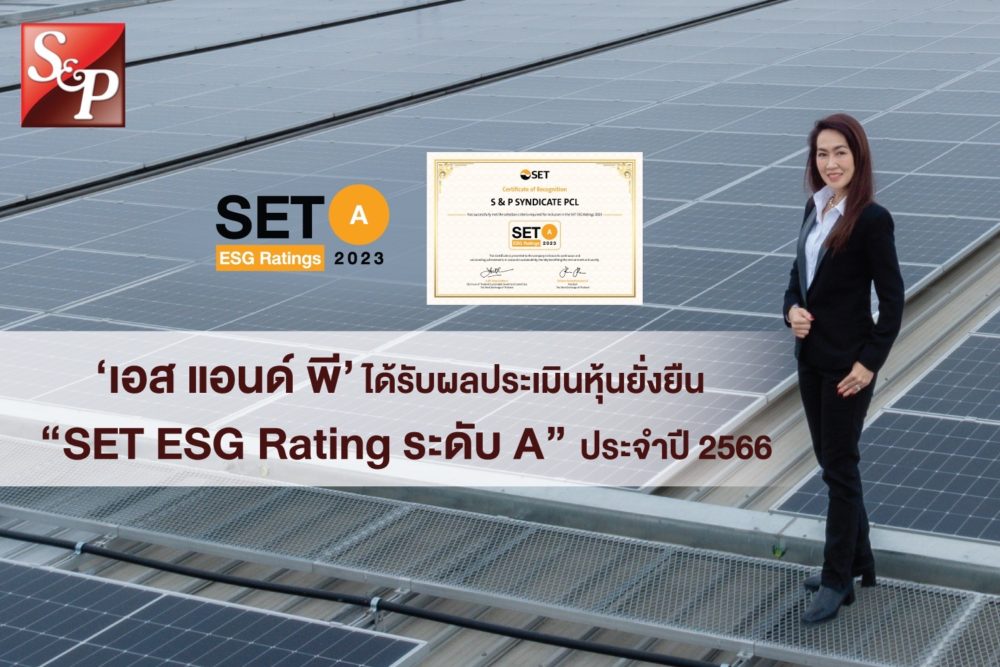 บริษัท เอส แอนด์ พี ซินดิเคท จำกัด (มหาชน) ได้รับการประเมิน “SET ESG Rating” ประจำปี 2566 ในระดับ A จากตลาดหลักทรัพย์แห่งประเทศไทย โดยเป็น 1 ใน 193 บริษัทจดทะเบียนที่ได้รับการประกาศผลประเมินหุ้นยั่งยืน SET ESG Ratings เป็นบริษัทที่มีการนำแนวคิดด้านความยั่งยืนเข้าเป็นส่วนหนึ่งในกระบวนการดำเนินธุรกิจ โดยคำนึงถึงการบริหารความเสี่ยงและเตรียมพร้อมรับความเสี่ยงที่เกิดขึ้นใหม่ (Emerging Risks) อีกทั้งพร้อมรับมือกับปัจจัยการเปลี่ยนแปลงด้านสังคมและสิ่งแวดล้อม เพิ่มขีดความสามารถในการแข่งขัน และให้ความสำคัญกับผู้มีส่วนได้เสียทุกภาคส่วนได้อย่างสมดุล