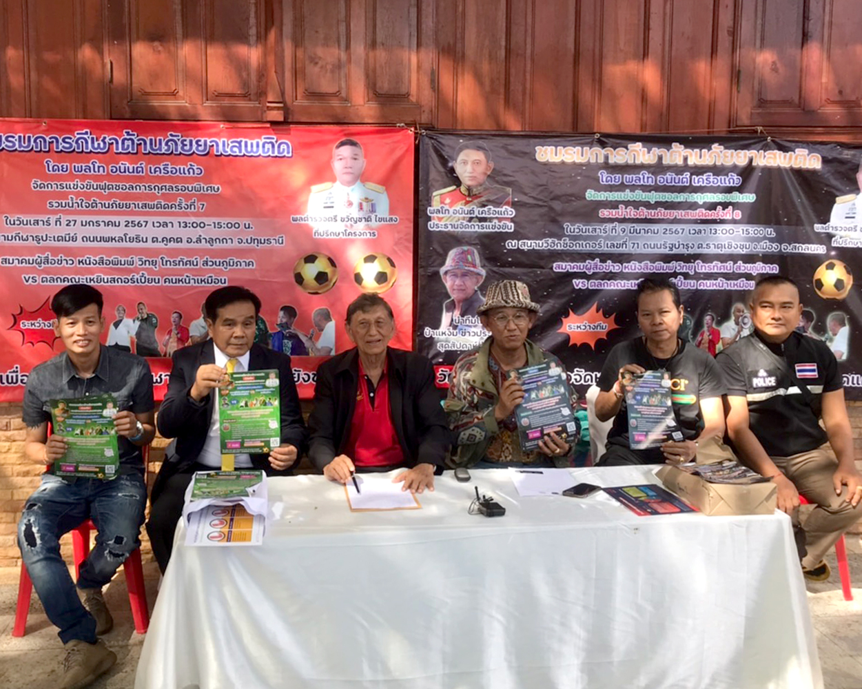 ชมรมการกีฬาต้านภัยยาเสพติด ขอขอบพระคุณผู้ที่ร่วมให้การสนับสนุนทุกท่านเป็นอย่างสูง และขอเชิญแขกท่านผู้มีเกียรติทุกท่านไปร่วมชมร่วมเชียร์ การแข่งขันฟุตบอลการกุศลนัดพิเศษ / รวมน้ำใจต้านภัยยาเสพติด ระหว่างทีมสมาคมผู้สื่อข่าวหนังสือพิมพ์ วิทยุ โทรทัศน์ ส่วนภูมิภาค นำทีมโดยป๋าแหง็ม ครับเจ้านาย (ข่าวช่วยชาวบ้าน) พบกับทีมตลกคณะเหยินสกอร์เปี้ยน คนหน้าเหมือน โดยการแข่งขันฟุตบอลการกุศลนัดพิเศษ / รวมน้ำใจต้านภัยยาเสพติด ครั้งที่ 7 จะจัดขึ้นในวันเสาร์ที่ 27 มกราคม พ.ศ. 2567 เวลา 13.00 – 15.00 น. ณ สนามกีฬาธูปะเตมีย์ ถนนพหลโยธิน ต.คูคต อ.ลำลูกกา จ.ปทุมธานี เพื่อมอบอุปกรณ์กีฬาให้กับโรงเรียนที่ยังขาดแคลน 5 โรงเรียน ได้แก่ 1. โรงเรียนวัดบ้านไร่ (ประชานุกูล) หมู่ 5 ต.พันท้ายนรสิงห์ อ.เมือง จ.สมุทรสาคร 2. โรงเรียนวัดยางหัก หมู่ 13 ต.ท่าผา อ.บ้านโป่ง จ.ราชบุรี 3. โรงเรียนวัดสว่างอารมณ์ หมู่ 2 ต.ดอนทอง อ.หนองโดน จ.สระบุรี 4. โรงเรียนวัดศิริจันทาราม หมู่ 13 ต.คลองห้า อ.คลองหลวง จ.ปทุมธานี และ 5. โรงเรียนวัดบางกอบัว (ขลิบราษฎร์บุรณะ) ต.บางกอบัว อ.พระประแดง จ.สมุทรปราการ