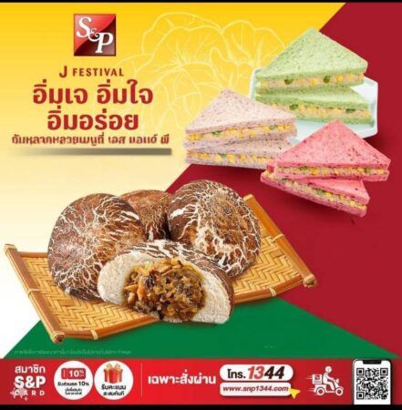 และผู้ที่ชื่นชอบเบเกอรี่ ปีนี้ เอส แอนด์ พี ส่งมอบความอิ่มใจ อิ่มอร่อย ผ่าน 8 เมนู ได้แก่ ขนมปังข้าวกล้องงอก, ขนมปังแครนเบอรี่ลูกเกดเจ, เค้กกล้วยหอมเจ, พายผักโขมเจ, พัฟเห็ดเจ, พัฟสับปะรด, พัฟเผือกแปะก๊วย และพายไก่เจ