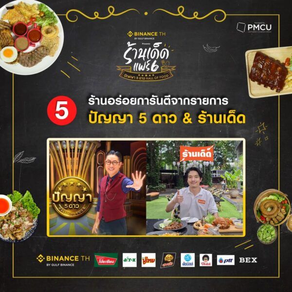 สายชิม สายกิน เตรียมกระเพาะไว้ให้ดี งานนี้จะได้สนุก จุก ฟิน ไปกับงานอาหารใจกลางเมืองสุดยิ่งใหญ่แห่งปี ที่กำลังจะกลับมาให้ได้ลิ้มรสเด็ดกันอีกครั้ง!! กับงาน “BINANCE TH แพลตฟอร์มเทรดสินทรัพย์ดิจิตอลมาตรฐานโลก presents ร้านเด็ดแฟร์ 6 ปัญญา 5 ดาว Hall of Food” ชวนสายชิลล์ สายกิน มาร่วม กิน สนุก จุก ฟิน ไปกับร้านเด็ด ชื่อดังทั่วไทย การันตี รสชาติ รสมือ ความอร่อย ความเด็ดสุดปัง จากรายการปัญญา 5 ดาว